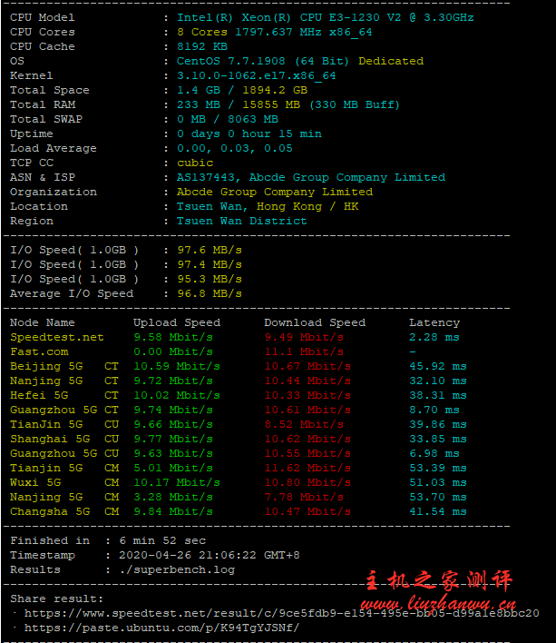 Softlayer, HongKong, CN 119.81.130.170 1.13MB/s
