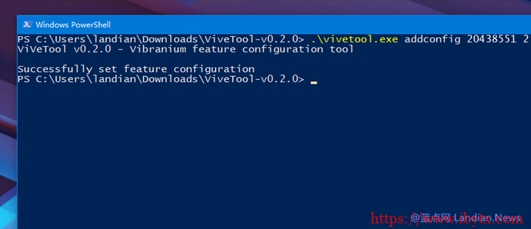 # 然后在PowerShell窗口里粘贴以下代码并按回车键 .vivetool.exe addconfig 20438551 2 # 如果手打命令的话注意 2 之前有个空格