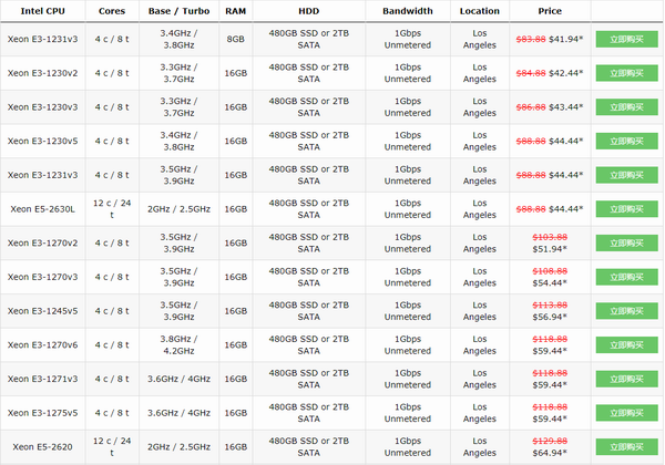 | E3-1230v3 | 16GB | 480G(SSD)或2T(HDD) | 1Gbps | 无限流量 | 1个(1800G防御) | $43.44/首月 |