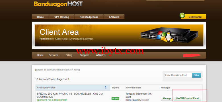 进入官网后,右上角点击“Client Area”进行登录。登录后,依次点击“Services -> My Services”,进入到已购买的VPS列表页。