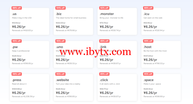 此次活动域名包括:.us、.biz、.monster、.icu、.pw、.uno、.link、host等,更全面的域名方案可以参考官网。