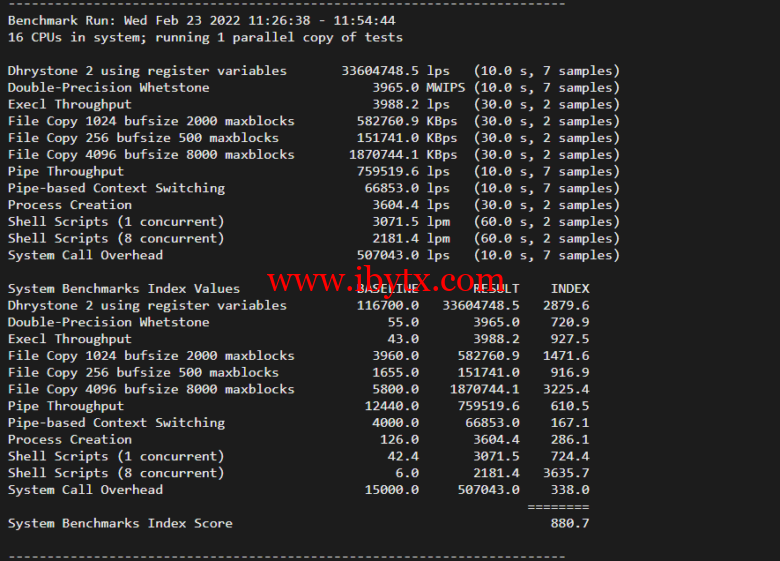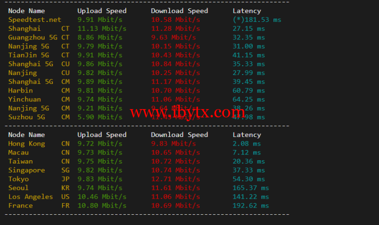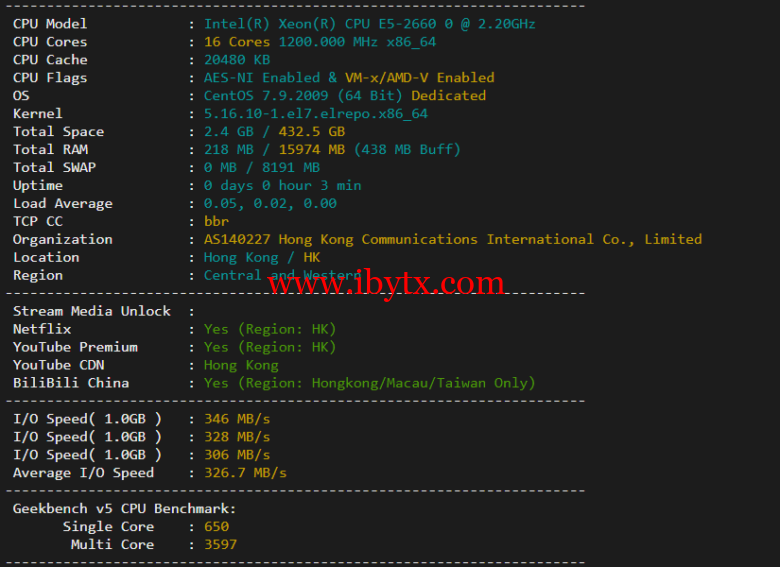 配置信息:CPU为e5-2660、16G内存、500G SSD、10M带宽、3个IPv4,开启bbr测试。平均硬盘I/O在326MB,上方红色标记套餐