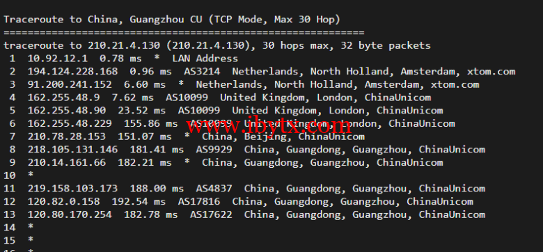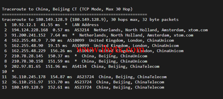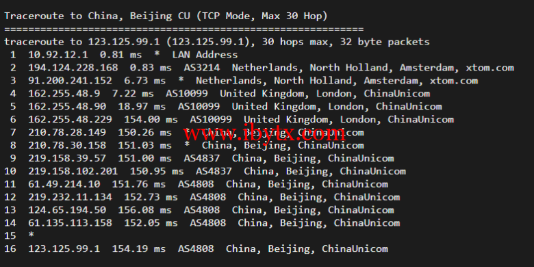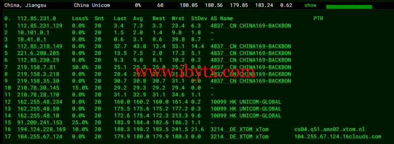 搬瓦工荷兰阿姆斯特丹 EUNL_9 机房,接入了联通高端路线 China Unicom Premium 路线,回程采用 AS10099/AS9929,速度快,延迟低,三网回程都会接入联通高端路线,总体上效果很好。不过机房位于荷兰,所以地理位置比较远,一般来说建议联通用户或者是有外贸网站需求的朋友选择,尤其是面向欧洲地区客户的朋友们。搬瓦工荷兰阿姆斯特丹机房编号为 EUNL_9,用的是 xTom 的机房和线路。