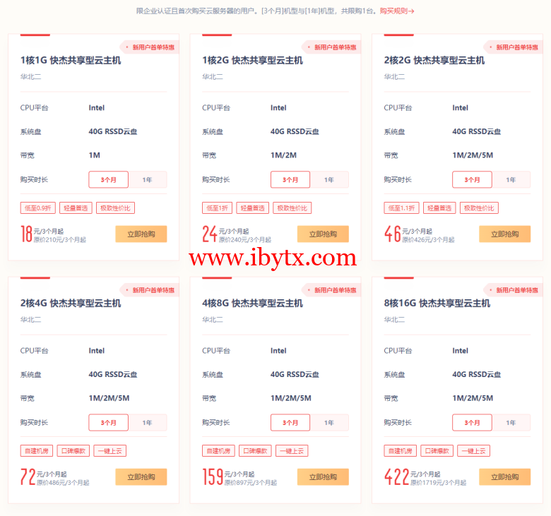 限企业认证且首次购买云服务器的用户。[3个月]机型与[1年]机型,共限购1台。下面为香港机房价格,台北机房价格也是一样的。