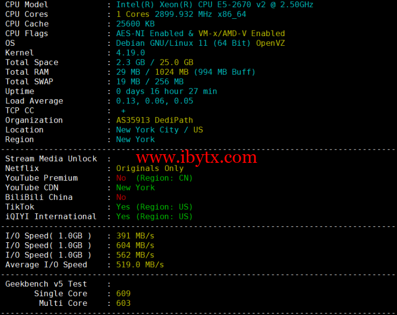 | 1核 | 2.5GB | 70GB RAID10 | 4TB/月 | 1Gbps | 2个ipv4 | $25/年 | 链接 |