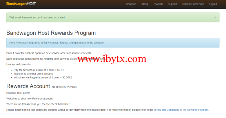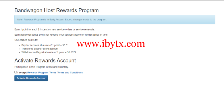 Bandwagon Host Rewards Program Note: Rewards Program is in Early Access. Expect frequent changes and adjustments made to the program. Earn 1 point for each $1 spent on new service orders or service renewals. Earn additional bonus points for keeping your services active for longer period of time. Use earned points to: Pay for services at a rate of 1 point = $0.01 Transfer to another client account Withdraw via Paypal at a rate of 1 point = $0.0072 Activate Rewards Account Participation in this Program is free and voluntary.