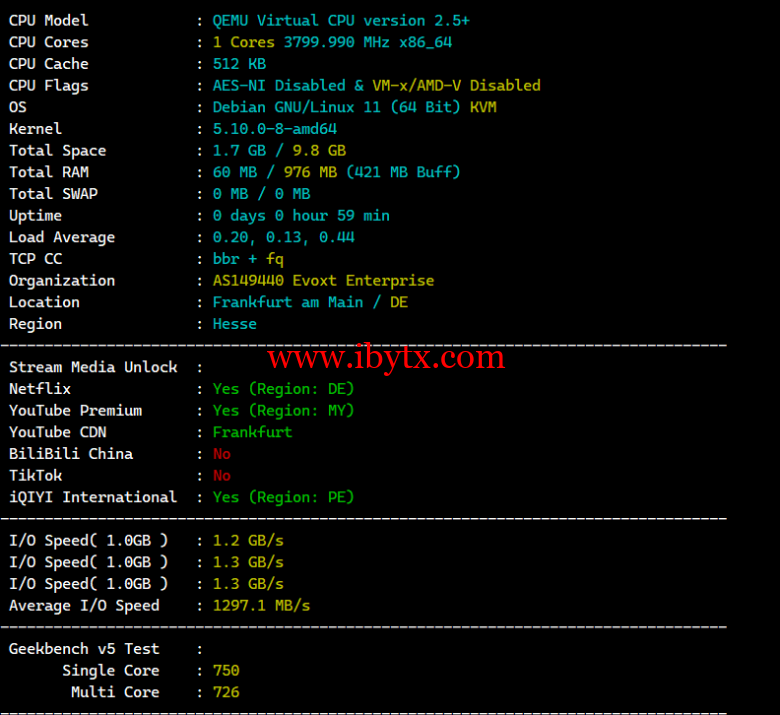 Evoxt上新了德国法兰克福机房,加上之前的美国洛杉矶、英国伦敦以及马来西亚,一共四个机房,本文针对德国法兰克福做个简单测评,方便大家购买参考,1核/512MB内存/5G硬盘/500G流量,$2.99 /月起,需要的可以围观。