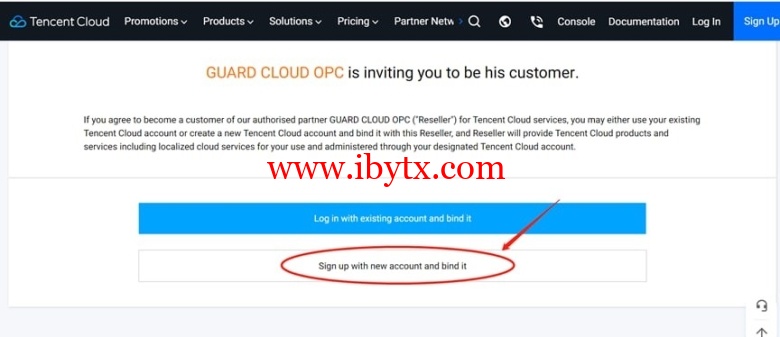 第二步,点击邀请链接后,会直接跳转到腾讯云海外版的注册页面,页面窗口有两个选项,一个是使用现有的账号登录并绑定,另一个是使用新账户注册并绑定;这里翼龙云YilongCloud建议大家使用新账户注册并绑定,因为之前现有的账户大多里面有个人的部分信息。