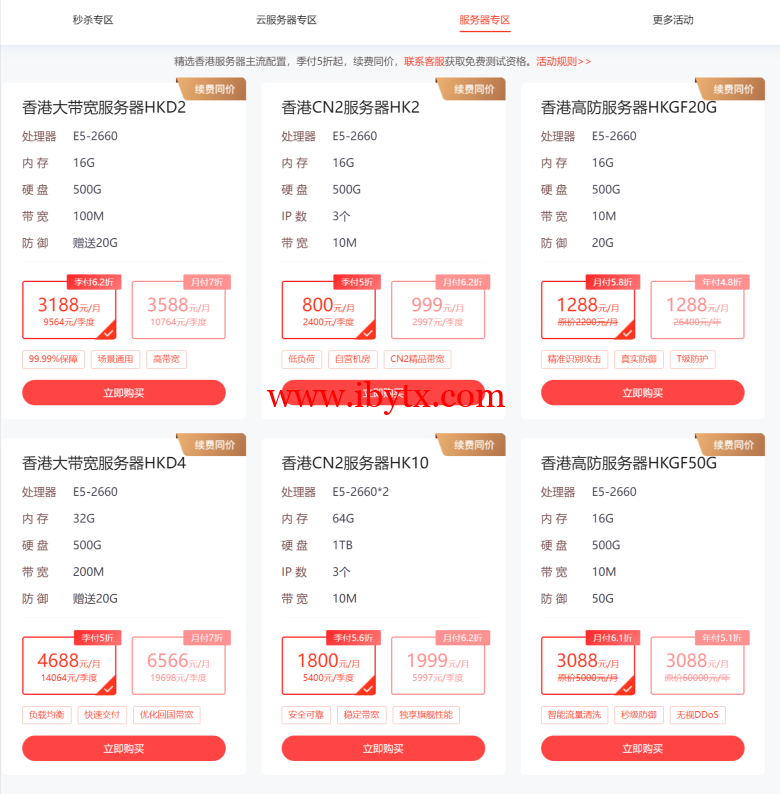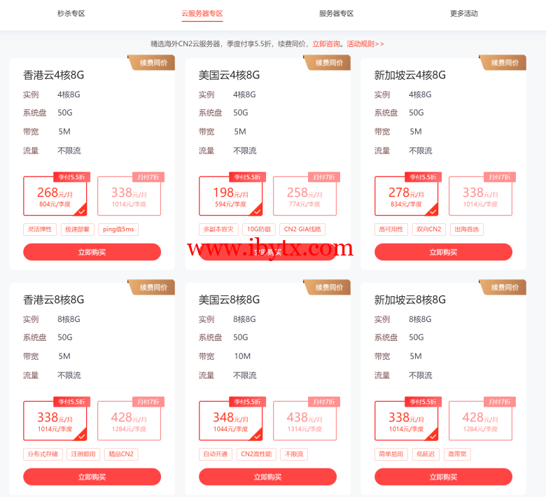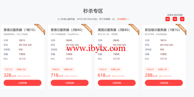 华纳云会在特定时间推出限时秒杀活动,用户可以在规定时间内购买到价格极低的服务器实例。比如1H1G云主机低至2.3折,24元/月,288/年。→点击这里
