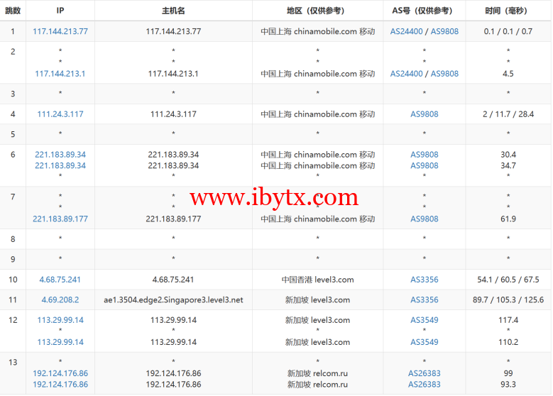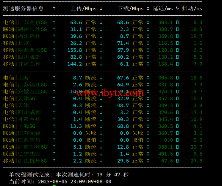 ----------------三网回程--感谢zhanghanyun/backtrace开源----------------- 2023/08/05 16:48:08 北京电信 219.141.136.12 电信163 [普通线路] 2023/08/05 16:48:08 北京联通 202.106.50.1 联通4837[普通线路] 2023/08/05 16:48:08 北京移动 221.179.155.161 移动CMI [普通线路] 2023/08/05 16:48:08 上海电信 202.96.209.133 电信163 [普通线路] 2023/08/05 16:48:08 上海联通 210.22.97.1 联通4837[普通线路] 2023/08/05 16:48:08 上海移动 211.136.112.200 移动CMI [普通线路] 2023/08/05 16:48:08 广州电信 58.60.188.222 测试超时 2023/08/05 16:48:08 广州联通 210.21.196.6 联通4837[普通线路] 2023/08/05 16:48:08 广州移动 120.196.165.24 移动CMI [普通线路] 2023/08/05 16:48:08 成都电信 61.139.2.69 电信163 [普通线路] 2023/08/05 16:48:08 成都联通 119.6.6.6 联通4837[普通线路] 2023/08/05 16:48:08 成都移动 211.137.96.205 移动CMI [普通线路]