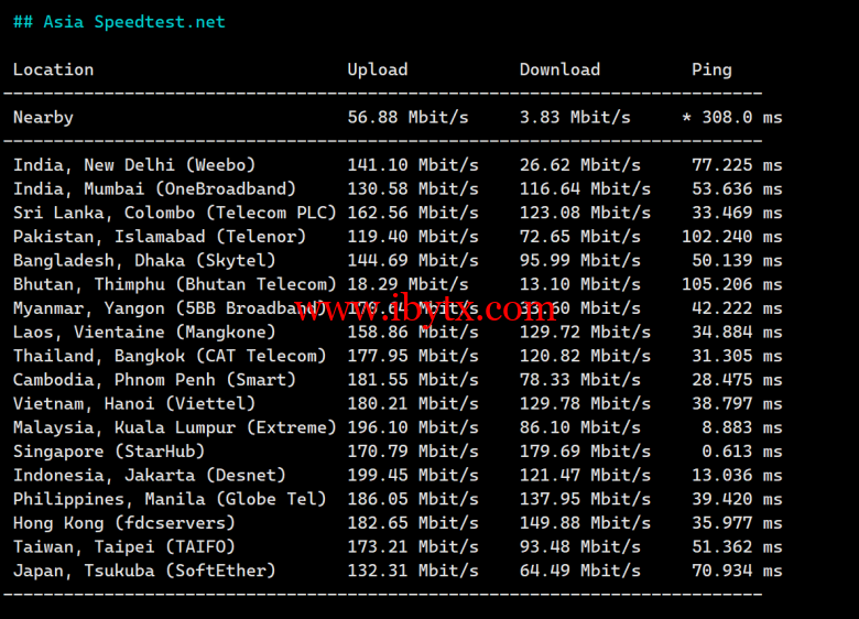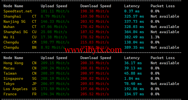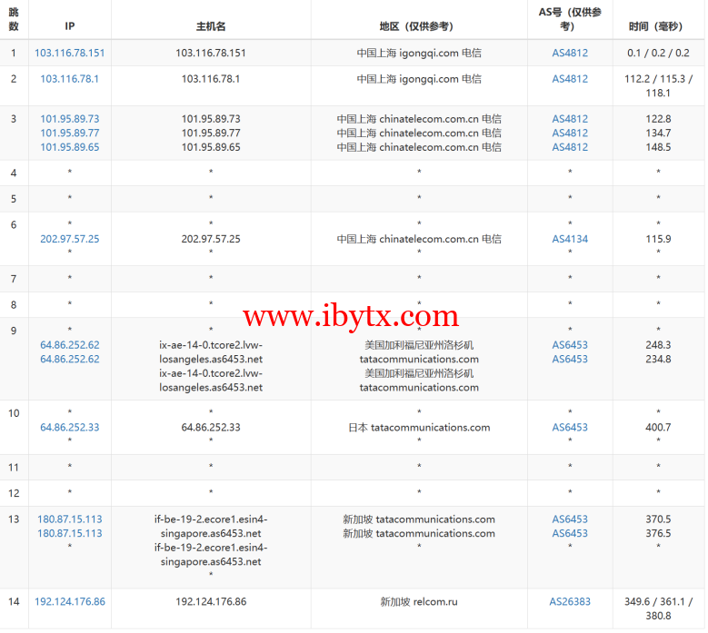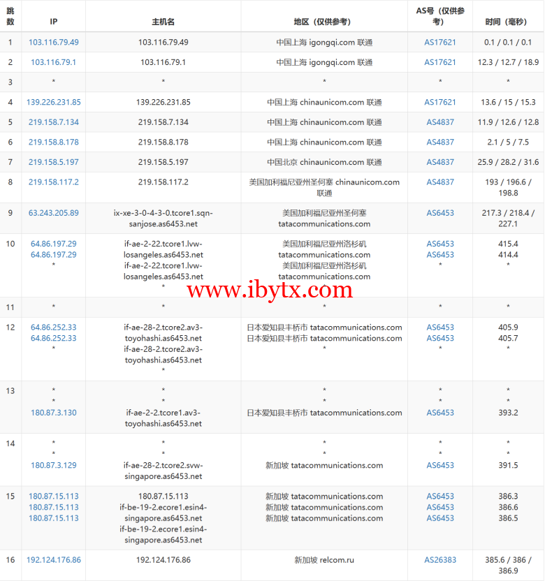 START -------------------- Round 1 - SuperTrace 路由到 - 北京电信 -------------------- traceroute to 106.37.68.26 (106.37.68.26), 30 hops max, 32 byte packets 1 gw.infra.ds.melbicom.net (185.140.210.105) 0.71 ms AS8849,AS56630 Singapore, host-stage.net 2 10.32.1.22 0.36 ms * LAN Address 3 * 4 * 5 TenGE0-2-0-1.br03.lax05.pccwbtn.net (63.218.72.166) 186.54 ms AS3491,AS31713 United States, California, Los Angeles, pccw.com 6 218.30.53.86 204.40 ms AS4134 United States, California, Los Angeles, ChinaTelecom 7 * 8 * 9 * 10 * 11 * 12 bj141-162-214.bjtelecom.net (219.141.162.214) 357.44 ms AS4847 China, Beijing, ChinaTelecom 13 bj141-160-38.bjtelecom.net (219.141.160.38) 361.13 ms AS4847 China, Beijing, ChinaTelecom 14 * 15 26.68.37.106.static.bjtelecom.net (106.37.68.26) 344.98 ms AS4847 China, Beijing, ChinaTelecom -------------------- Round 2 - SuperTrace 路由到 - 北京联通 -------------------- traceroute to 202.96.18.1 (202.96.18.1), 30 hops max, 32 byte packets 1 gw.infra.ds.melbicom.net (185.140.210.105) 1.85 ms AS8849,AS56630 Singapore, host-stage.net 2 * 3 * 4 if-ae-45-2.tcore1.svw-singapore.as6453.net (180.87.108.5) 191.60 ms AS6453 Singapore, tatacommunications.com 5 if-et-23-2.hcore2.kv8-chiba.as6453.net (180.87.67.33) 77.94 ms AS6453 Japan, Chiba, tatacommunications.com 6 if-et-1-2.hcore1.kv8-chiba.as6453.net (120.29.211.2) 72.27 ms AS6453 Japan, Chiba, tatacommunications.com 7 if-ae-28-7.tcore2.sv1-santaclara.as6453.net (209.58.86.18) 178.43 ms AS6453 United States, California, Santa Clara, tatacommunications.com 8 if-ae-26-2.tcore1.sqn-sanjose.as6453.net (209.58.86.37) 175.76 ms AS6453 United States, California, San Jose, tatacommunications.com 9 63.243.205.90 183.95 ms AS6453 United States, California, San Jose, tatacommunications.com 10 219.158.100.25 320.37 ms AS4837 China, Beijing, ChinaUnicom 11 219.158.16.65 342.88 ms AS4837 China, Beijing, ChinaUnicom 12 219.158.5.149 324.41 ms AS4837 China, Beijing, ChinaUnicom 13 61.149.203.46 327.88 ms AS4808 China, Beijing, ChinaUnicom 14 61.148.6.186 320.48 ms AS4808 China, Beijing, ChinaUnicom 15 61.148.74.222 328.67 ms AS4808 China, Beijing, ChinaUnicom 16 * 17 * 18 * 19 202.96.18.1 345.56 ms AS4808 China, Beijing, ChinaUnicom -------------------- Round 3 - SuperTrace 路由到 - 北京移动 -------------------- traceroute to 211.136.66.129 (211.136.66.129), 30 hops max, 32 byte packets 1 gw.infra.ds.melbicom.net (185.140.210.105) 0.42 ms AS8849,AS56630 Singapore, host-stage.net 2 ix-tengige-0-0-0-33-0.ecore3.esin4-singapore.as6453.net (180.87.108.200) 1.03 ms AS6453 Singapore, tatacommunications.com 3 180.87.108.163 0.48 ms AS6453 Singapore, tatacommunications.com 4 * 5 * 6 ae-1.a02.tkokhk01.hk.bb.gin.ntt.net (129.250.5.39) 34.22 ms AS2914 China, Hong Kong, ntt.com 7 * 8 223.120.2.53 36.63 ms AS58453 China, Hong Kong, ChinaMobile 9 223.120.2.42 37.02 ms AS58453 China, Hong Kong, ChinaMobile 10 223.120.22.142 113.51 ms AS58453 China, Beijing, ChinaMobile 11 221.183.55.106 113.70 ms AS9808 China, Beijing, ChinaMobile 12 221.183.46.250 115.43 ms AS9808 China, Beijing, ChinaMobile 13 * 14 221.183.76.74 118.14 ms AS9808 China, Beijing, ChinaMobile 15 211.136.66.129 115.84 ms AS56048 China, Beijing, ChinaMobile -------------------- Round 4 - SuperTrace 路由到 - 北京教育 -------------------- traceroute to 210.31.160.77 (210.31.160.77), 30 hops max, 32 byte packets 1 gw.infra.ds.melbicom.net (185.140.210.105) 0.42 ms AS8849,AS56630 Singapore, host-stage.net 2 * 3 223.120.2.105 33.90 ms AS58453 China, Hong Kong, ChinaMobile 4 223.120.3.86 33.98 ms AS58453 China, Hong Kong, ChinaMobile 5 223.119.81.94 160.61 ms AS58453 China, Hong Kong, ChinaMobile 6 101.4.114.221 192.92 ms AS4538 China, Beijing, CHINAEDU 7 101.4.116.121 193.47 ms AS4538 China, Beijing, CHINAEDU 8 101.4.114.193 191.90 ms AS4538 China, Beijing, CHINAEDU 9 101.4.117.81 192.50 ms AS4538 China, Beijing, CHINAEDU 10 101.4.116.94 193.65 ms AS4538 China, Beijing, CHINAEDU 11 101.4.117.134 194.18 ms AS4538 China, Beijing, CHINAEDU 12 * 13 210.31.160.77 192.50 ms AS4538 China, Beijing, CHINAEDU -------------------- Round 5 - SuperTrace 路由到 - 上海电信 -------------------- traceroute to 101.95.89.90 (101.95.89.90), 30 hops max, 32 byte packets 1 gw.infra.ds.melbicom.net (185.140.210.105) 1.88 ms AS8849,AS56630 Singapore, host-stage.net 2 10.32.1.22 0.49 ms * LAN Address 3 * 4 * 5 TenGE0-0-0-3.br03.lax05.pccwbtn.net (63.223.43.98) 184.88 ms AS3491,AS31713 United States, California, Los Angeles, pccw.com 6 TenGE0-0-0-3.br03.lax05.pccwbtn.net (63.223.43.98) 184.87 ms AS3491,AS31713 United States, California, Los Angeles, pccw.com 7 218.30.53.86 205.94 ms AS4134 United States, California, Los Angeles, ChinaTelecom 8 202.97.89.141 364.90 ms AS4134 China, Shanghai, ChinaTelecom 9 202.97.90.34 349.77 ms AS4134 China, Shanghai, ChinaTelecom 10 * 11 61.152.25.137 359.03 ms AS4812 China, Shanghai, ChinaTelecom 12 101.95.89.90 356.25 ms AS4812 China, Shanghai, ChinaTelecom -------------------- Round 6 - SuperTrace 路由到 - 上海联通 -------------------- traceroute to 219.158.111.253 (219.158.111.253), 30 hops max, 32 byte packets 1 gw.infra.ds.melbicom.net (185.140.210.105) 2.11 ms AS8849,AS56630 Singapore, host-stage.net 2 ix-tengige-0-0-0-33-0.ecore3.esin4-singapore.as6453.net (180.87.108.200) 0.70 ms AS6453 Singapore, tatacommunications.com 3 * 4 * 5 * 6 * 7 * 8 * 9 if-ae-2-2.tcore1.lvw-losangeles.as6453.net (66.110.59.1) 175.97 ms AS6453 United States, California, Los Angeles, tatacommunications.com 10 219.158.40.189 346.21 ms AS4837 United States, California, Los Angeles, ChinaUnicom 11 219.158.96.25 349.88 ms AS4837 China, Beijing, ChinaUnicom 12 219.158.3.49 363.28 ms AS4837 China, Beijing, ChinaUnicom 13 * 14 * 15 219.158.111.253 426.80 ms AS4837 China, Shanghai, ChinaUnicom -------------------- Round 7 - SuperTrace 路由到 - 上海移动 -------------------- traceroute to 221.183.89.46 (221.183.89.46), 30 hops max, 32 byte packets 1 gw.infra.ds.melbi