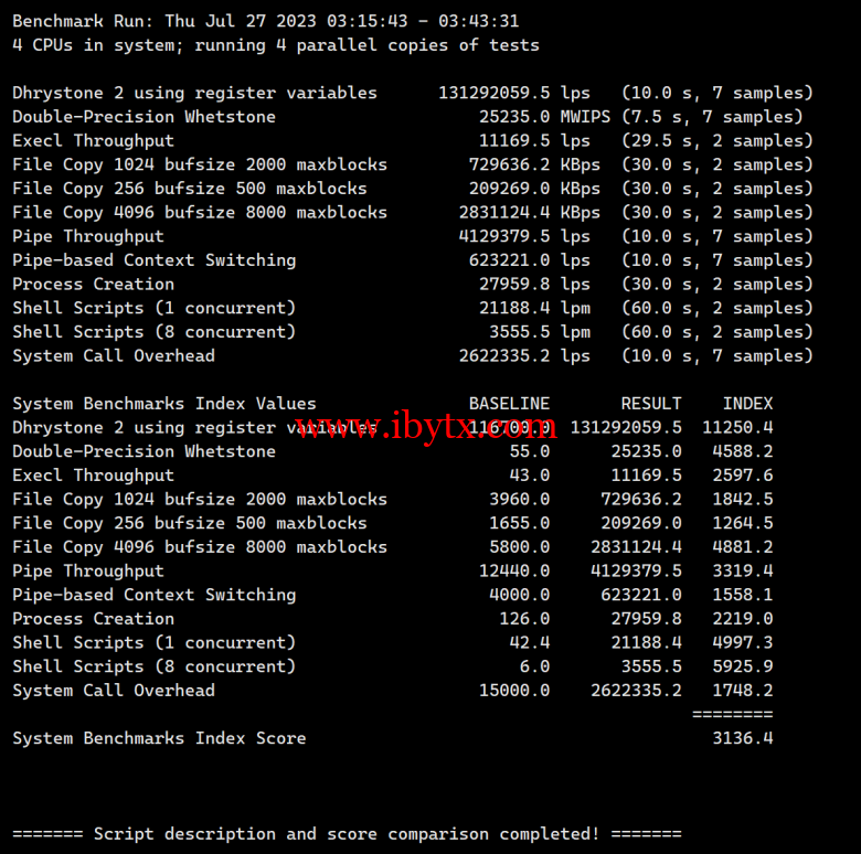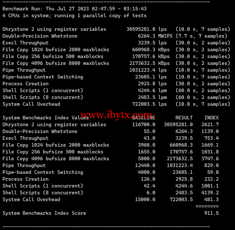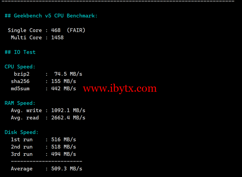 ---------------------基础信息查询--感谢所有开源项目--------------------- CPU 型号 : Intel(R) Xeon(R) CPU E5-2697 v4 @ 2.30GHz CPU 核心数 : 4 CPU 频率 : 2299.996 MHz CPU 缓存 : L1: 256.00 KB / L2: 16.00 MB / L3: 16.00 MB 硬盘空间 : 1.50 GiB / 50.11 GiB 启动盘路径 : /dev/vda1 内存 : 301.16 MiB / 3.84 GiB Swap : [ no swap partition or swap file detected ] 系统在线时间 : 9 days, 23 hour 8 min 负载 : 0.43, 0.13, 0.04 系统 : Debian GNU/Linux 11 (bullseye) (x86_64) AES-NI指令集 : ✔ Enabled VM-x/AMD-V支持 : ✔ Enabled 架构 : x86_64 (64 Bit) 内核 : 5.10.0-20-amd64 TCP加速方式 : bbr 虚拟化架构 : KVM NAT类型 : 开放型 IPV4 ASN : AS26383 Baxet Group Inc. IPV4 位置 : Singapore / Singapore / SG ---------------------CPU测试--感谢lemonbench开源------------------------ -> CPU 测试中 (Fast Mode, 1-Pass @ 5sec) 1 线程测试(1核)得分: 757 Scores 4 线程测试(多核)得分: 2936 Scores ---------------------内存测试--感谢lemonbench开源----------------------- -> 内存测试 Test (Fast Mode, 1-Pass @ 5sec) 单线程读测试: 11108.17 MB/s 单线程写测试: 10976.84 MB/s ------------------磁盘dd读写测试--感谢lemonbench开源-------------------- -> 磁盘IO测试中 (4K Block/1M Block, Direct Mode) 测试操作 写速度 读速度 100MB-4K Block 18.0 MB/s (4394 IOPS, 5.83s) 35.4 MB/s (8643 IOPS, 2.96s) 1GB-1M Block 788 MB/s (752 IOPS, 1.33s) 789 MB/s (752 IOPS, 1.33s)