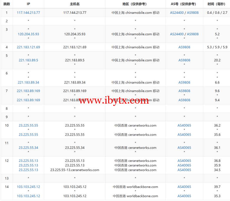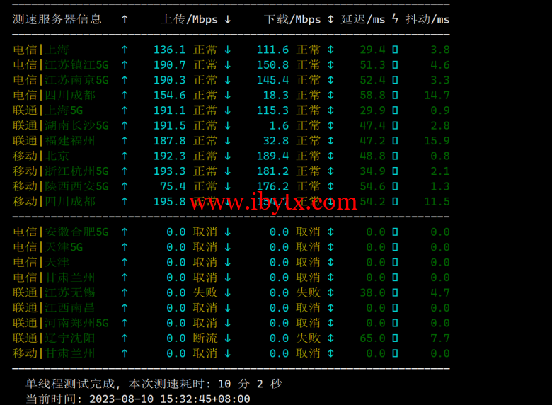 2023/08/10 04:47:49 正在测试三网回程路由... 2023/08/10 04:47:50 北京电信 219.141.136.12 移动CMI [普通线路] 2023/08/10 04:47:50 北京联通 202.106.50.1 移动CMI [普通线路] 2023/08/10 04:47:50 北京移动 221.179.155.161 移动CMI [普通线路] 2023/08/10 04:47:50 上海电信 202.96.209.133 移动CMI [普通线路] 2023/08/10 04:47:50 上海联通 210.22.97.1 移动CMI [普通线路] 2023/08/10 04:47:50 上海移动 211.136.112.200 移动CMI [普通线路] 2023/08/10 04:47:50 广州电信 58.60.188.222 移动CMI [普通线路] 2023/08/10 04:47:50 广州联通 210.21.196.6 移动CMI [普通线路] 2023/08/10 04:47:50 广州移动 120.196.165.24 移动CMI [普通线路] 2023/08/10 04:47:50 成都电信 61.139.2.69 移动CMI [普通线路] 2023/08/10 04:47:50 成都联通 119.6.6.6 移动CMI [普通线路] 2023/08/10 04:47:50 成都移动 211.137.96.205 移动CMI [普通线路] 2023/08/10 04:47:50 湖南电信 36.111.200.100 移动CMI [普通线路] 2023/08/10 04:47:50 湖南联通 42.48.16.100 移动CMI [普通线路] 2023/08/10 04:47:50 湖南移动 39.134.254.6 移动CMI [普通线路]