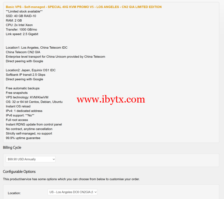 本次套餐名为“SPECIAL 40G KVM PROMO V5 – LOS ANGELES – CN2 GIA LIMITED EDITION VPS”,一般来说,搬瓦工 CN2 GIA-E 限量版、CN2 GIA 限量版这些名字目前基本上都可以混用了,所以为了区分,我们将这款套餐简称为 CN2 GIA-E 40G 限量版套餐。