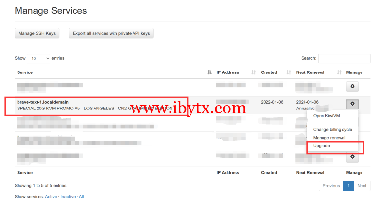 如果之前已经购买,我们可以在所有 VPS 列表中看到,然后点击 Upgrade,就可以看到升级页面,如下图所示。