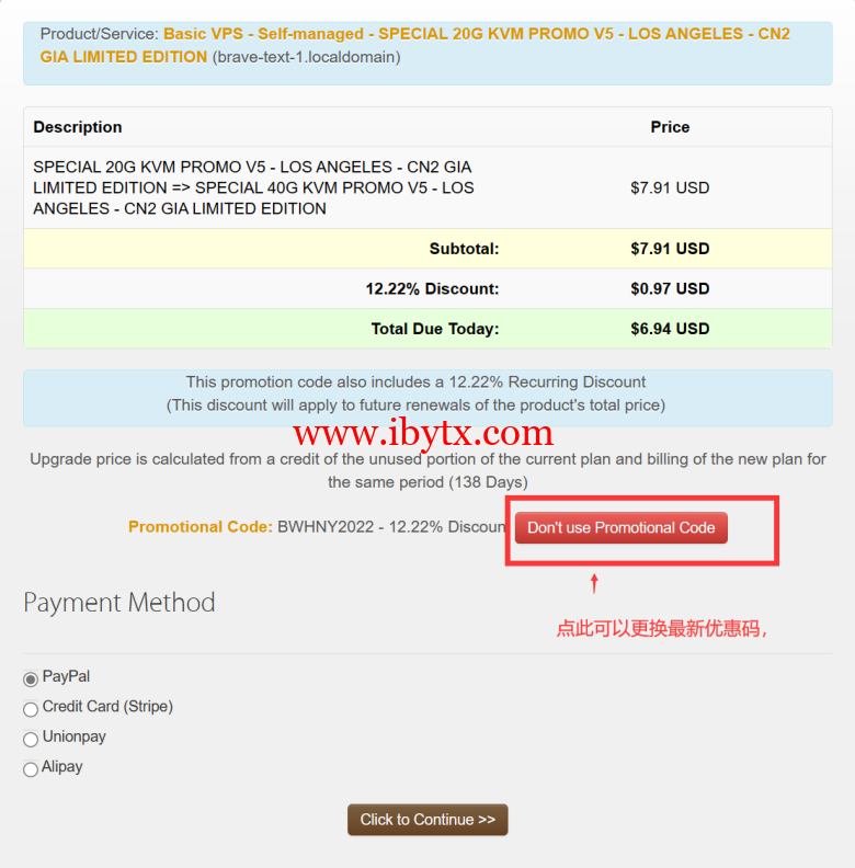 继续进入下一步,可以看到升级所需要补的差价。除此之外还可以将之前的优惠码替换成最新的优惠码,只需要点击 Don’t use Promotional Code,如下图所示。
