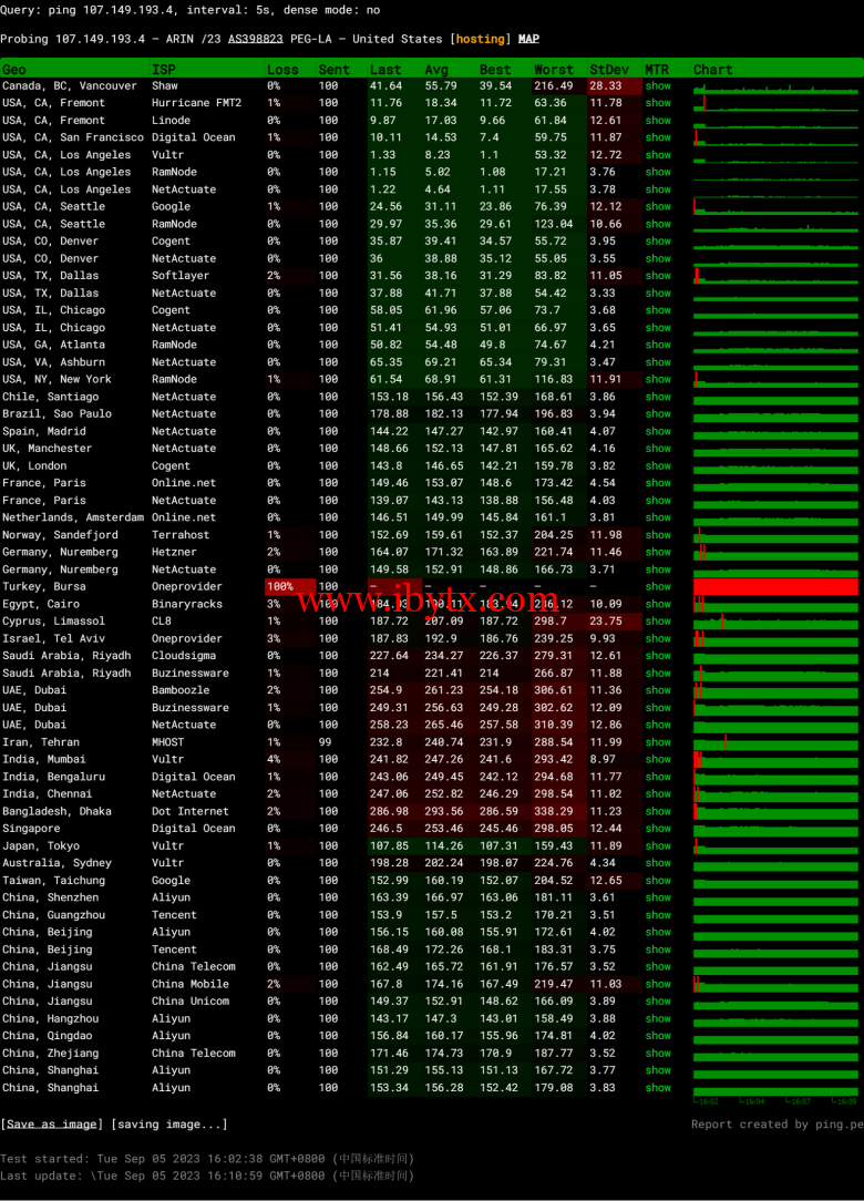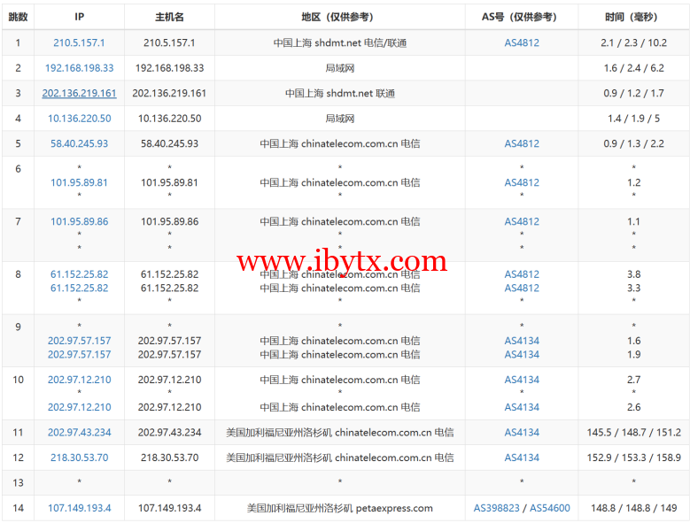 广州电信 58.60.188.222 1.11 ms AS398823 [PT-82] 美国 加利福尼亚州 洛杉矶 petaexpress.com 1.19 ms * [RFC1918] 局域网 1.25 ms AS10099 [CUG-BACKBONE] 美国 加利福尼亚州 洛杉矶 chinaunicomglobal.com 131.18 ms AS10099 [CUG-BACKBONE] 中国 上海市 chinaunicomglobal.com 联通 129.96 ms AS9929 [CNC-BACKBONE] 中国 上海市 chinaunicom.cn 联通 CUII 155.25 ms AS9929 [CNC-BACKBONE] 中国 广东省 广州市 chinaunicom.cn 联通 CUII 161.44 ms * [APNIC-AP] 中国 广东省 广州市 156.85 ms AS4134 [CHINANET-BB] 中国 广东省 广州市 chinatelecom.com.cn 电信 160.27 ms AS134774 [CHINANET-GD] 中国 广东省 深圳市 chinatelecom.cn 电信 160.27 ms AS4134 中国 广东省 深圳市 福田区 chinatelecom.com.cn 电信 广州联通 210.21.196.6 1.30 ms AS398823 [PT-82] 美国 加利福尼亚州 洛杉矶 petaexpress.com 1.07 ms * [RFC1918] 局域网 1.36 ms AS10099 [CUG-BACKBONE] 美国 加利福尼亚州 洛杉矶 chinaunicomglobal.com 129.59 ms AS10099 [CUG-BACKBONE] 中国 上海市 chinaunicomglobal.com 联通 129.86 ms AS9929 [CNC-BACKBONE] 中国 上海市 chinaunicom.cn 联通 CUII 155.22 ms AS9929 [CNC-BACKBONE] 中国 广东省 广州市 chinaunicom.cn 联通 CUII 161.61 ms * [APNIC-AP] 中国 广东省 广州市 166.56 ms AS4837 [CU169-BACKBONE] 中国 广东省 广州市 chinaunicom.cn 联通 157.32 ms AS4837 [CU169-BACKBONE] 中国 广东省 广州市 chinaunicom.cn 联通 161.34 ms AS17816 [UNICOM-GD] 中国 广东省 深圳市 chinaunicom.cn 联通 162.23 ms AS17623 [APNIC-AP] 中国 广东省 深圳市 chinaunicom.cn 联通 159.64 ms AS17623 [APNIC-AP] 中国 广东省 深圳市 宝安区 chinaunicom.cn 联通 广州移动 120.196.165.24 2.05 ms AS398823 [PT-82] 美国 加利福尼亚州 洛杉矶 petaexpress.com 1.24 ms * [RFC1918] 局域网 1.58 ms AS10099 [CUG-BACKBONE] 美国 加利福尼亚州 洛杉矶 chinaunicomglobal.com 129.23 ms AS10099 [CUG-BACKBONE] 中国 上海市 chinaunicomglobal.com 联通 149.09 ms AS9929 [CNC-BACKBONE] 中国 上海市 chinaunicom.cn 联通 CUII 156.30 ms AS9929 [CNC-BACKBONE] 中国 广东省 广州市 chinaunicom.cn 联通 CUII 157.23 ms * [APNIC-AP] 中国 广东省 广州市 160.44 ms AS4837 [CU169-BACKBONE] 中国 广东省 广州市 chinaunicom.cn 联通 259.20 ms AS4837 [CU169-BACKBONE] 中国 香港 chinaunicom.cn 联通 160.37 ms AS9808 [CMNET] 中国 广东省 广州市 chinamobile.com 移动 157.55 ms AS9808 [CMNET] 中国 北京市 chinamobile.com 移动 160.66 ms AS56040 [APNIC-AP] 中国 广东省 深圳市 chinamobile.com 移动 ------------------------------------------------------------------------ 上海电信 202.96.209.133 1.33 ms AS398823 [PT-82] 美国 加利福尼亚州 洛杉矶 petaexpress.com 1.19 ms * [RFC1918] 局域网 1.29 ms AS10099 [CUG-BACKBONE] 美国 加利福尼亚州 洛杉矶 chinaunicomglobal.com 136.14 ms AS10099 [CUG-BACKBONE] 中国 上海市 chinaunicomglobal.com 联通 136.39 ms AS9929 [CNC-BACKBONE] 中国 上海市 chinaunicom.cn 联通 CUII 136.42 ms AS9929 [CNC-BACKBONE] 中国 上海市 chinaunicom.cn 联通 CUII 140.22 ms AS4134 [CHINANET-BB] 中国 上海市 chinatelecom.com.cn 电信 140.87 ms AS4812 [CHINANET-SH] 中国 上海市 chinatelecom.cn 电信 138.57 ms AS4812 [CHINANET-SH] 中国 上海市 chinatelecom.cn 电信 上海联通 210.22.97.1 1.08 ms AS398823 [PT-82] 美国 加利福尼亚州 洛杉矶 petaexpress.com 1.31 ms * [RFC1918] 局域网 1.18 ms AS10099 [CUG-BACKBONE] 美国 加利福尼亚州 洛杉矶 chinaunicomglobal.com 135.68 ms AS10099 [CUG-BACKBONE] 中国 上海市 chinaunicomglobal.com 联通 136.16 ms AS9929 [CNC-BACKBONE] 中国 上海市 chinaunicom.cn 联通 CUII 137.69 ms AS9929 [CNC-BACKBONE] 中国 上海市 chinaunicom.cn 联通 CUII 142.28 ms AS4837 [CU169-BACKBONE] 中国 上海市 chinaunicom.cn 联通 137.53 ms AS17621 [APNIC-AP] 中国 上海市 chinaunicom.cn 联通 138.88 ms AS17621 [APNIC-AP] 中国 上海市 闵行区 chinaunicom.cn 联通 上海移动 211.136.112.200 2.74 ms AS398823 [PT-82] 美国 加利福尼亚州 洛杉矶 petaexpress.com 1.20 ms * [RFC1918] 局域网 1.28 ms AS10099 [CUG-BACKBONE] 美国 加利福尼亚州 洛杉矶 chinaunicomglobal.com 129.64 ms AS10099 [CUG-BACKBONE] 中国 上海市 chinaunicomglobal.com 联通 131.61 ms AS9929 [CNC-BACKBONE] 中国 上海市 chinaunicom.cn 联通 CUII 129.88 ms AS9929 [CNC-BACKBONE] 中国 上海市 chinaunicom.cn 联通 CUII 132.33 ms AS4837 [CU169-BACKBONE] 中国 上海市 chinaunicom.cn 联通 163.71 ms AS9808 [CMNET] 中国 上海市 chinamobile.com 移动 159.56 ms AS9808 [CMNET] 中国 上海市 chinamobile.com 移动 176.34 ms AS24400 [CMNET] 中国 上海市 chinamobile.com 移动 155.68 ms AS24400 [CMNET] 中国 上海市 chinamobile.com 移动 155.44 ms AS24400 [CMNET] 中国 上海市 浦东新区 chinamobile.com 移动 ------------------------------------------------------------------------ 北京电信 219.141.136.12 1.14 ms AS398823 [PT-82] 美国 加利福尼亚州 洛杉矶 petaexpress.com 1.17 ms * [RFC1918] 局域网 1.27 ms AS10099 [CUG-BACKBONE] 美国 加利福尼亚州 洛杉矶 chinaunicomglobal.com 129.57 ms AS10099 [CUG-BACKBONE] 中国 上海市 chinaunicomglobal.com 联通 129.88 ms AS9929 [CNC-BACKBONE] 中国 上海市 chinaunicom.cn 联通 CUII 150.13 ms AS9929 [CNC-BACKBONE] 中国 北京市 chinaunicom.cn 联通 CUII 154.49 ms * [CNC-BACKBONE] 中国 北京市 chinaunicom.cn 联通 CUII 170.35 ms AS4134 [CHINANET-BB] 中国 天津市 chinatelecom.com.cn 电信 166.22 ms AS4847 [CHINANET-GD] 中国 北京市 chinatelecom.cn 175.81 ms AS4847 [CHINATELECOM-BJ] 中国 北京市 chinatelecom.cn 北京联通 202.106.50.1 2.58 ms AS398823 [PT-82] 美国 加利福尼亚州 洛杉矶 petaexpress.com 1.05 ms * [RFC1918] 局域网 1.36 ms AS10099 [CUG-BACKBONE] 美国 加利福尼亚州 洛杉矶 chinaunicomglobal.com 136.13 ms AS10099 [CUG-BACKBONE] 中国 上海市 chinaunicomglobal.com 联通 136.36 ms AS9929 [CNC-BACKBONE] 