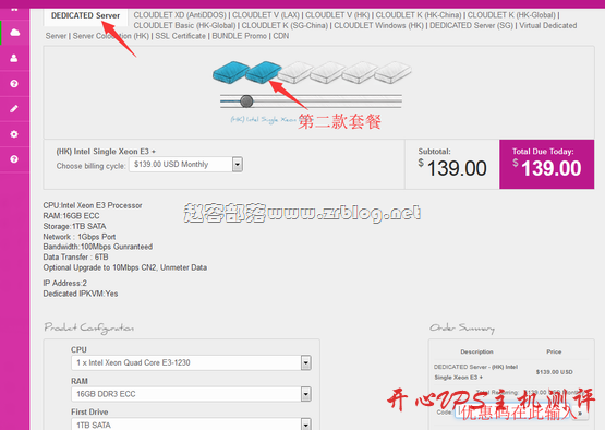 上面这款机器请记得使用优惠码,月付104.25美元,季付299.25美元,半年524.25美元,年付922.5美元(周期越久价格越便宜)。在会员中心的位置如图(头部选择DEDICATED Server,然后选择第二款套餐,请留意图中优惠码输入款):