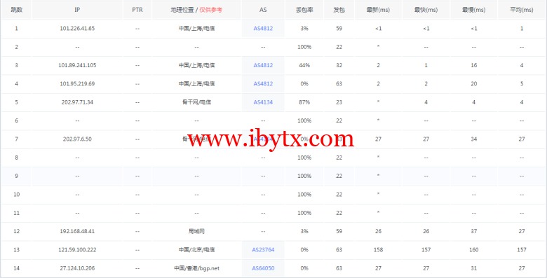 看完ping值检测后,下面我们再看看联通、移动、电信三网去程路由线路情况。
