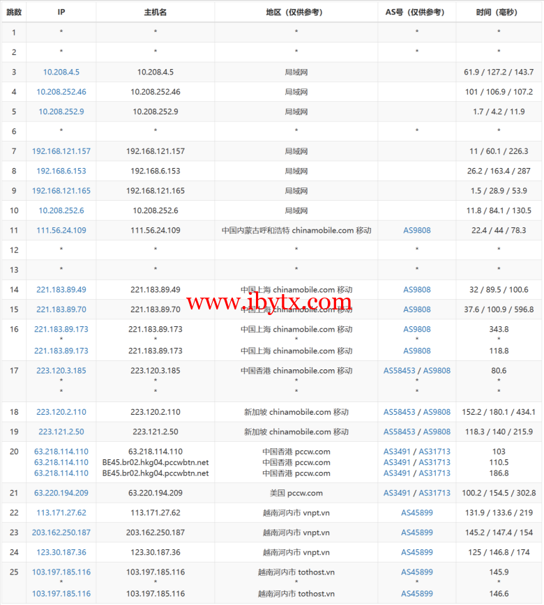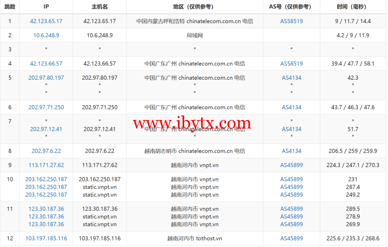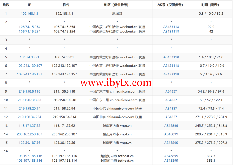START -------------------- Round 1 - SuperTrace 路由到 - 北京电信 -------------------- traceroute to 106.37.68.26 (106.37.68.26), 30 hops max, 32 byte packets 1 103.197.185.254 0.63 ms AS45899 越南, 河内市, tothost.vn 2 static.vnpt.vn (123.30.187.33) 23.32 ms AS45899 越南, 河内市, vnpt.vn 3 static.vnpt.vn (203.162.250.186) 28.51 ms AS45899 越南, 河内市, vnpt.vn 4 static.vnpt.vn (113.171.27.33) 45.55 ms AS45899 越南, 河内市, vnpt.vn 5 * 6 static.vnpt.vn (113.171.35.119) 37.94 ms AS45899 中国, 香港, vnpt.vn 7 63-220-194-208.static.pccwglobal.net (63.220.194.208) 36.78 ms AS3491,AS31713 美国, pccw.com 8 * 9 HundredGE0-5-0-0.br03.lax05.pccwbtn.net (63.218.72.230) 205.13 ms AS3491,AS31713 美国, 加利福尼亚州, 洛杉矶, pccw.com 10 218.30.53.86 240.60 ms AS4134 美国, 加利福尼亚州, 洛杉矶, chinatelecom.com.cn, 电信 11 * 12 * 13 * 14 * 15 * 16 36.112.226.189 236.01 ms AS4847 中国, 北京, chinatelecom.com.cn, 电信 17 bj141-160-38.bjtelecom.net (219.141.160.38) 243.56 ms AS4847 中国, 北京, chinatelecom.com.cn, 电信 18 * 19 * 20 26.68.37.106.static.bjtelecom.net (106.37.68.26) 260.21 ms AS4847 中国, 北京, chinatelecom.com.cn, 电信 -------------------- Round 2 - SuperTrace 路由到 - 北京联通 -------------------- traceroute to 202.96.18.1 (202.96.18.1), 30 hops max, 32 byte packets 1 103.197.185.254 0.66 ms AS45899 越南, 河内市, tothost.vn 2 static.vnpt.vn (123.30.187.33) 21.61 ms AS45899 越南, 河内市, vnpt.vn 3 static.vnpt.vn (203.162.250.190) 17.75 ms AS45899 越南, 河内市, vnpt.vn 4 static.vnpt.vn (113.171.27.125) 39.70 ms AS45899 越南, 河内市, vnpt.vn 5 static.vnpt.vn (113.171.5.114) 21.19 ms AS45899 越南, 河内市, vnpt.vn 6 static.vnpt.vn (113.171.35.119) 34.19 ms AS45899 中国, 香港, vnpt.vn 7 63-220-194-208.static.pccwglobal.net (63.220.194.208) 17.78 ms AS3491,AS31713 美国, pccw.com 8 * 9 * 10 * 11 * 12 WS-CHINAUNICOM-HK-OPERATIONSLTD-C.customer.alter.net (157.130.246.202) 313.31 ms AS701 美国, 加利福尼亚州, 洛杉矶, verizon.com 13 219.158.16.97 369.61 ms AS4837 中国, 北京, chinaunicom.com, 联通 14 219.158.3.141 364.73 ms AS4837 中国, 北京, chinaunicom.com, 联通 15 * 16 * 17 61.148.159.18 365.45 ms AS4808 中国, 北京, chinaunicom.com, 联通 18 61.148.74.222 364.37 ms AS4808 中国, 北京, chinaunicom.com, 联通 19 202.106.86.4 357.41 ms AS4808 中国, 北京, chinaunicom.com, 联通 20 * 21 * 22 202.96.18.1 365.29 ms AS4808 中国, 北京, chinaunicom.com, 联通 -------------------- Round 3 - SuperTrace 路由到 - 北京移动 -------------------- traceroute to 211.136.66.129 (211.136.66.129), 30 hops max, 32 byte packets 1 103.197.185.254 0.67 ms AS45899 越南, 河内市, tothost.vn 2 static.vnpt.vn (123.30.187.33) 24.96 ms AS45899 越南, 河内市, vnpt.vn 3 static.vnpt.vn (203.162.250.190) 7.06 ms AS45899 越南, 河内市, vnpt.vn 4 * 5 static.vnpt.vn (113.171.16.93) 16.90 ms AS45899 越南, 河内市, vnpt.vn 6 static.vnpt.vn (113.171.35.119) 37.07 ms AS45899 中国, 香港, vnpt.vn 7 te0-0-0-30-0.sbr05.lax05.pccwbtn.net (63.218.212.5) 181.45 ms AS3491,AS31713 美国, 加利福尼亚州, 洛杉矶, pccw.com 8 lax-b22-link.ip.twelve99.net (213.248.97.138) 263.19 ms AS1299 美国, 加利福尼亚州, 洛杉矶, telia.com 9 chinamobile-ic-342123.ip.twelve99-cust.net (62.115.171.219) 196.32 ms AS1299 美国, 加利福尼亚州, 洛杉矶, telia.com 10 223.120.6.22 187.23 ms AS58453 美国, 加利福尼亚州, 洛杉矶, chinamobile.com, 移动 11 223.120.12.214 256.30 ms AS58453 中国, 上海, chinamobile.com, 移动 12 221.183.55.110 257.30 ms AS9808 中国, 北京, chinamobile.com, 移动 13 221.183.25.201 278.95 ms AS9808 中国, 北京, chinamobile.com, 移动 14 221.183.89.118 263.99 ms AS9808 中国, 北京, chinamobile.com, 移动 15 * 16 221.179.171.41 261.85 ms AS56048 中国, 北京, chinamobile.com, 移动 17 211.136.66.129 261.67 ms AS56048 中国, 北京, chinamobile.com, 移动 -------------------- Round 4 - SuperTrace 路由到 - 北京教育 -------------------- traceroute to 210.31.160.77 (210.31.160.77), 30 hops max, 32 byte packets 1 103.197.185.254 0.62 ms AS45899 越南, 河内市, tothost.vn 2 static.vnpt.vn (123.30.187.33) 17.67 ms AS45899 越南, 河内市, vnpt.vn 3 static.vnpt.vn (203.162.250.190) 35.44 ms AS45899 越南, 河内市, vnpt.vn 4 static.vnpt.vn (113.171.27.125) 71.42 ms AS45899 越南, 河内市, vnpt.vn 5 static.vnpt.vn (113.171.27.90) 74.41 ms AS45899 越南, 胡志明市, vnpt.vn 6 static.vnpt.vn (113.171.50.222) 62.83 ms AS45899 越南, 胡志明市, vnpt.vn 7 static.vnpt.vn (113.171.36.245) 65.58 ms AS45899 新加坡, vnpt.vn 8 121.59.128.49 63.70 ms * 亚太地区, chinatelecom.com.cn, 电信 9 CN.HKG.CTGNet (69.194.165.61) 117.88 ms * 中国, 香港, chinatelecom.com.cn, 电信 10 203.25.50.30 83.69 ms * 中国, 香港, chinatelecom.com.cn, 电信 11 * 12 202.97.83.21 106.11 ms AS4134 中国, 上海, chinatelecom.com.cn, 电信 13 * 14 202.97.68.98 111.80 ms AS4134 中国, 湖北, 武汉, chinatelecom.com.cn, 电信 15 * 16 * 17 101.4.117.125 103.61 ms AS4538 中国, 北京, edu.cn, 教育网 18 * 19 * 20 * 21 101.4.117.134 104.54 ms AS4538 中国, 北京, edu.cn, 教育网 22 * 23 210.31.160.77 122.91 ms AS4538,AS24349 中国, 北京, 中国青年政治学院, edu.cn, 教育网 -------------------- Round 5 - SuperTrace 路由到 - 上海电信 -------------------- traceroute to 101.95.89.90 (101.95.89.90), 30 hops max, 32 byte packets 1 103.197.185.254 0.62 ms AS45899 越南, 河内市, tothost.vn 2 static.vnpt.vn (123.30.187.33) 23.06 ms AS45899 越南, 河内市, vnpt.vn 3 static.vnpt.vn (203.162.250.186) 21.15 ms AS45899 越南, 河内市, vnpt.vn 4 * 5 static.vnpt.vn (113.171.16.93) 24.58 ms AS45899 越南, 河内市, vnpt.vn 6 203.215.232.237 42.97 ms AS4134 中国, 香港, chinatelecom.com.cn, 电信 7 202.97.6.5 65.62 ms AS4134 中国, 上海, chinatelecom.com.cn, 电信 8 * 9 * 10 101.95.89.90 65.93 ms