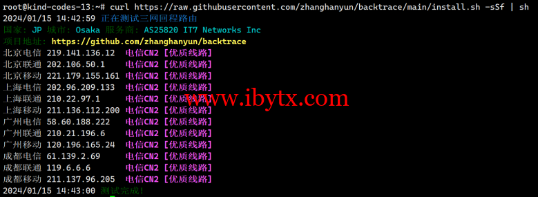 下面是搬瓦工日本大阪 CN2 GIA 机房的回程路由跟踪结果,三网回程都是接入 59.43 开头的 CN2 GIA 节点的,效果非常好。
