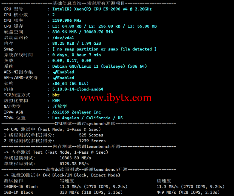 默认CPU为2696V4,使用KVM虚拟化,主频2.20GHz