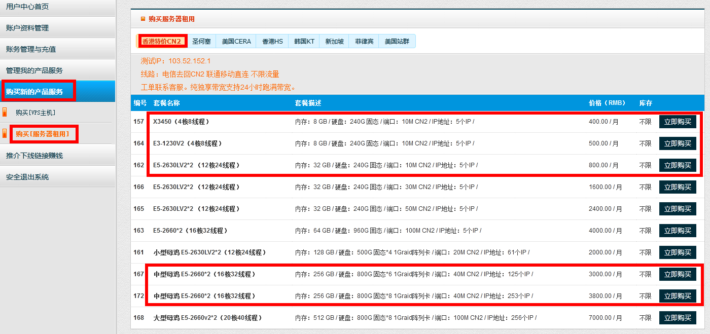 | X3450(4核8线程) | 8GB | 240G | 10M | 5个 | 400.00 / 月 | 点击购买 |