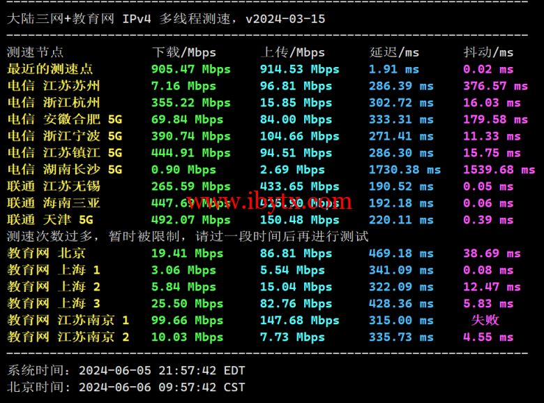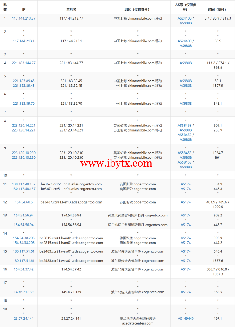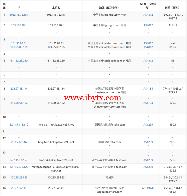 Round 1 - SuperTrace 路由到 - 北京电信 -------------------- traceroute to 106.37.68.26 (106.37.68.26), 30 hops max, 32 byte packets 1 23.27.24.1 0.23 ms AS149440 波兰, 马佐夫舍省, 维什库夫, acedatacenters.com 2 10.255.254.1 1.60 ms * 局域网 3 * 4 be2486.ccr21.waw01.atlas.cogentco.com (154.54.37.41) 3.19 ms AS174 波兰, 马佐夫舍省, 华沙, cogentco.com 5 be2483.ccr41.ham01.atlas.cogentco.com (130.117.51.62) 14.76 ms AS174 德国, 汉堡, cogentco.com 6 be5163.ccr42.fra03.atlas.cogentco.com (154.54.39.213) 23.20 ms AS174 德国, 黑森州, 法兰克福, cogentco.com 7 be3187.agr41.fra03.atlas.cogentco.com (130.117.1.117) 23.12 ms AS174 德国, 黑森州, 法兰克福, cogentco.com 8 chinatelecom.demarc.cogentco.com (149.14.159.114) 75.07 ms AS174 德国, 黑森州, 法兰克福, cogentco.com 9 * 10 * 11 * 12 * 13 * 14 bj141-162-214.bjtelecom.net (219.141.162.214) 280.25 ms AS4847 中国, 北京, chinatelecom.com.cn, 电信 15 bj141-160-38.bjtelecom.net (219.141.160.38) 350.56 ms AS4847 中国, 北京, chinatelecom.com.cn, 电信 16 * 17 26.68.37.106.static.bjtelecom.net (106.37.68.26) 298.95 ms AS4847 中国, 北京, chinatelecom.com.cn, 电信 Round 5 - SuperTrace 路由到 - 上海电信 -------------------- traceroute to 101.95.89.90 (101.95.89.90), 30 hops max, 32 byte packets 1 23.27.24.1 0.21 ms AS149440 波兰, 马佐夫舍省, 维什库夫, acedatacenters.com 2 10.255.254.1 1.67 ms * 局域网 3 * 4 be2486.ccr21.waw01.atlas.cogentco.com (154.54.37.41) 2.63 ms AS174 波兰, 马佐夫舍省, 华沙, cogentco.com 5 be2484.ccr42.ham01.atlas.cogentco.com (130.117.51.106) 14.66 ms AS174 德国, 汉堡, cogentco.com 6 be2798.ccr42.fra03.atlas.cogentco.com (154.54.58.229) 23.01 ms AS174 德国, 黑森州, 法兰克福, cogentco.com 7 be3187.agr41.fra03.atlas.cogentco.com (130.117.1.117) 22.96 ms AS174 德国, 黑森州, 法兰克福, cogentco.com 8 chinatelecom.demarc.cogentco.com (149.14.159.114) 74.38 ms AS174 德国, 黑森州, 法兰克福, cogentco.com 9 * 10 202.97.51.242 280.50 ms AS4134 中国, 上海, chinatelecom.com.cn, 电信 11 * 12 * 13 101.95.89.90 302.45 ms AS4812 中国, 上海, chinatelecom.com.cn, 电信 Round 9 - SuperTrace 路由到 - 广州电信 -------------------- traceroute to 219.135.131.210 (219.135.131.210), 30 hops max, 32 byte packets 1 23.27.24.1 0.35 ms AS149440 波兰, 马佐夫舍省, 维什库夫, acedatacenters.com 2 10.255.254.1 1.61 ms * 局域网 3 * 4 be2486.ccr21.waw01.atlas.cogentco.com (154.54.37.41) 2.74 ms AS174 波兰, 马佐夫舍省, 华沙, cogentco.com 5 be2484.ccr42.ham01.atlas.cogentco.com (130.117.51.106) 14.74 ms AS174 德国, 汉堡, cogentco.com 6 be2798.ccr42.fra03.atlas.cogentco.com (154.54.58.229) 23.21 ms AS174 德国, 黑森州, 法兰克福, cogentco.com 7 be3187.agr41.fra03.atlas.cogentco.com (130.117.1.117) 23.87 ms AS174 德国, 黑森州, 法兰克福, cogentco.com 8 * 9 * 10 * 11 * 12 * 13 * 14 * 15 * 16 206.131.135.219.broad.gz.gd.dynamic.163data.com.cn (219.135.131.206) 537.45 ms AS134773 中国, 广东, 广州, chinatelecom.com.cn, 电信 17 * 18 210.131.135.219.broad.gz.gd.dynamic.163data.com.cn (219.135.131.210) 537.22 ms AS134773 中国, 广东, 广州, chinatelecom.com.cn, 电信