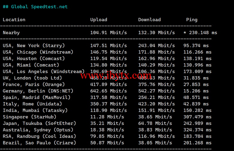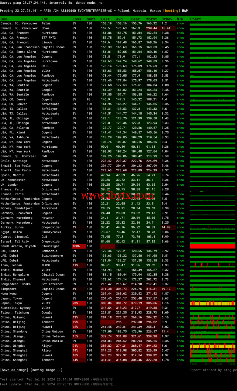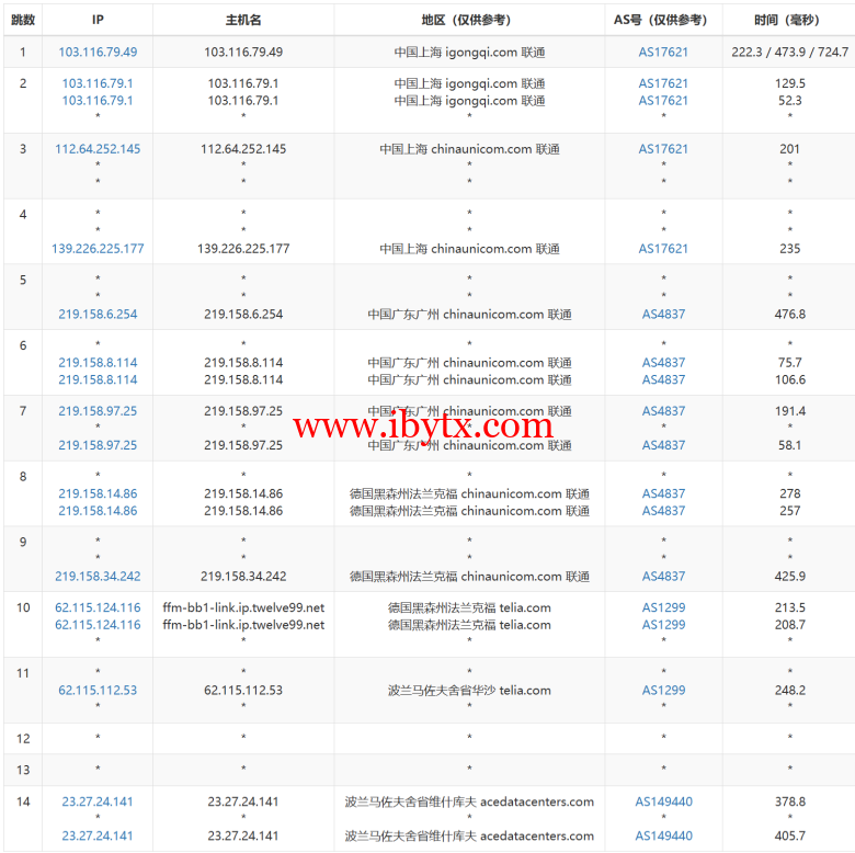 Round 2 - SuperTrace 路由到 - 北京联通 -------------------- traceroute to 202.96.18.1 (202.96.18.1), 30 hops max, 32 byte packets 1 23.27.24.1 0.33 ms AS149440 波兰, 马佐夫舍省, 维什库夫, acedatacenters.com 2 10.255.254.1 1.76 ms * 局域网 3 * 4 be2486.ccr21.waw01.atlas.cogentco.com (154.54.37.41) 2.70 ms AS174 波兰, 马佐夫舍省, 华沙, cogentco.com 5 be2484.ccr42.ham01.atlas.cogentco.com (130.117.51.106) 14.90 ms AS174 德国, 汉堡, cogentco.com 6 be2798.ccr42.fra03.atlas.cogentco.com (154.54.58.229) 23.34 ms AS174 德国, 黑森州, 法兰克福, cogentco.com 7 be3187.agr41.fra03.atlas.cogentco.com (130.117.1.117) 23.20 ms AS174 德国, 黑森州, 法兰克福, cogentco.com 8 149.11.181.26 21.54 ms AS174 德国, 黑森州, 法兰克福, cogentco.com 9 219.158.6.77 177.85 ms AS4837 中国, 北京, chinaunicom.com, 联通 10 219.158.9.113 169.51 ms AS4837 中国, 北京, chinaunicom.com, 联通 11 * 12 * 13 61.148.159.18 169.31 ms AS4808 中国, 北京, chinaunicom.com, 联通 14 61.148.74.222 176.87 ms AS4808 中国, 北京, chinaunicom.com, 联通 15 202.106.86.4 172.84 ms AS4808 中国, 北京, chinaunicom.com, 联通 16 * 17 * 18 202.96.18.1 169.33 ms AS4808 中国, 北京, chinaunicom.com, 联通 Round 6 - SuperTrace 路由到 - 上海联通 -------------------- traceroute to 219.158.111.253 (219.158.111.253), 30 hops max, 32 byte packets 1 23.27.24.1 0.51 ms AS149440 波兰, 马佐夫舍省, 维什库夫, acedatacenters.com 2 10.255.254.1 1.70 ms * 局域网 3 * 4 be2486.ccr21.waw01.atlas.cogentco.com (154.54.37.41) 2.61 ms AS174 波兰, 马佐夫舍省, 华沙, cogentco.com 5 be2483.ccr41.ham01.atlas.cogentco.com (130.117.51.62) 15.03 ms AS174 德国, 汉堡, cogentco.com 6 be5163.ccr42.fra03.atlas.cogentco.com (154.54.39.213) 23.14 ms AS174 德国, 黑森州, 法兰克福, cogentco.com 7 be2846.rcr22.fra06.atlas.cogentco.com (154.54.37.30) 23.42 ms AS174 德国, 黑森州, 法兰克福, cogentco.com 8 be3277.nr51.b037206-0.fra06.atlas.cogentco.com (154.25.2.166) 23.85 ms AS174 德国, 黑森州, 法兰克福, cogentco.com 9 149.14.68.114 21.24 ms AS174 德国, 黑森州, 法兰克福, cogentco.com 10 219.158.3.237 167.78 ms AS4837 中国, 广东, 广州, chinaunicom.com, 联通 11 219.158.103.29 180.12 ms AS4837 中国, 广东, 广州, chinaunicom.com, 联通 12 * 13 219.158.111.253 195.09 ms AS4837 中国, 上海, chinaunicom.com, 联通 Round 10 - SuperTrace 路由到 - 广州联通 -------------------- traceroute to 210.21.11.1 (210.21.11.1), 30 hops max, 32 byte packets 1 23.27.24.1 0.19 ms AS149440 波兰, 马佐夫舍省, 维什库夫, acedatacenters.com 2 10.255.254.1 1.91 ms * 局域网 3 * 4 be2486.ccr21.waw01.atlas.cogentco.com (154.54.37.41) 2.38 ms AS174 波兰, 马佐夫舍省, 华沙, cogentco.com 5 be2483.ccr41.ham01.atlas.cogentco.com (130.117.51.62) 14.84 ms AS174 德国, 汉堡, cogentco.com 6 be5163.ccr42.fra03.atlas.cogentco.com (154.54.39.213) 23.38 ms AS174 德国, 黑森州, 法兰克福, cogentco.com 7 be2846.rcr22.fra06.atlas.cogentco.com (154.54.37.30) 23.64 ms AS174 德国, 黑森州, 法兰克福, cogentco.com 8 be3277.nr51.b037206-0.fra06.atlas.cogentco.com (154.25.2.166) 23.78 ms AS174 德国, 黑森州, 法兰克福, cogentco.com 9 149.11.84.186 21.34 ms AS174 德国, 黑森州, 法兰克福, cogentco.com 10 219.158.3.237 166.10 ms AS4837 中国, 广东, 广州, chinaunicom.com, 联通 11 219.158.4.33 167.02 ms AS4837 中国, 广东, 广州, chinaunicom.com, 联通 12 219.158.3.97 168.40 ms AS4837 中国, 广东, 广州, chinaunicom.com, 联通 13 * 14 210.21.11.1 165.10 ms AS17622 中国, 广东, 广州, chinaunicom.com, 联通