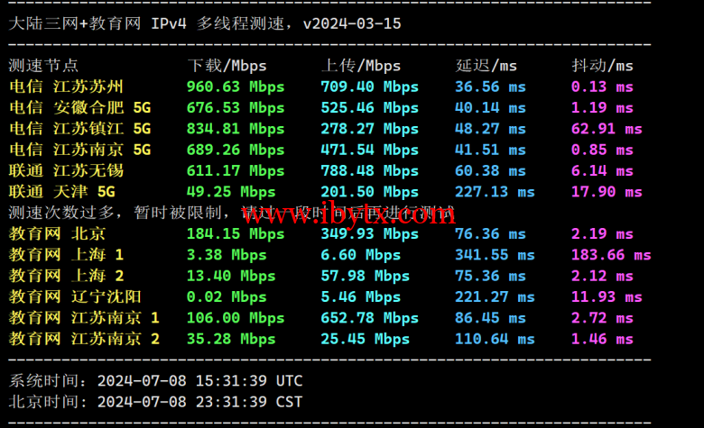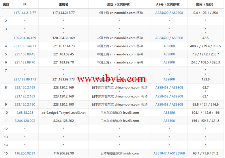 北京移动 traceroute to 221.179.155.161 (221.179.155.161), 30 hops max, 32 byte packets 1 116.206.92.1 1.07 ms AS51847 Japan, Tokyo, hisidc.com 2 10.50.1.1 1.24 ms * LAN Address 3 * 4 * 5 * 6 * 7 * 8 * 9 221.183.46.178 73.09 ms AS9808 China, Beijing, ChinaMobile 10 221.183.130.142 76.20 ms AS9808 China, Beijing, ChinaMobile 11 cachedns03.bj.chinamobile.com (221.179.155.161) 74.61 ms AS56048 China, Beijing, ChinaMobile ---------------------------------------------------------------------- 上海移动 traceroute to 211.136.112.200 (211.136.112.200), 30 hops max, 32 byte packets 1 116.206.92.1 5.61 ms AS51847 Japan, Tokyo, hisidc.com 2 10.50.1.1 0.91 ms * LAN Address 3 * 4 * 5 * 6 * 7 * 8 * 9 * 10 * 11 211.136.112.252 36.54 ms AS24400 China, Shanghai, ChinaMobile 12 211.136.112.200 307.85 ms AS24400 China, Shanghai, ChinaMobile ---------------------------------------------------------------------- 深圳移动 traceroute to 120.196.165.24 (120.196.165.24), 30 hops max, 32 byte packets 1 116.206.92.1 3.02 ms AS51847 Japan, Tokyo, hisidc.com 2 10.50.1.1 0.77 ms * LAN Address 3 * 4 * 5 * 6 * 7 * 8 * 9 * 10 221.183.71.78 62.84 ms AS9808 China, Guangdong, Guangzhou, ChinaMobile 11 221.183.110.166 67.28 ms AS9808 China, Guangdong, Guangzhou, ChinaMobile 12 ns6.gd.cnmobile.net (120.196.165.24) 70.53 ms AS56040 China, Guangdong, Shenzhen, ChinaMobile ---------------------------------------------------------------------- 成都教育网 traceroute to 202.112.14.151 (202.112.14.151), 30 hops max, 32 byte packets 1 116.206.92.1 1.00 ms AS51847 Japan, Tokyo, hisidc.com 2 10.50.1.1 1.14 ms * LAN Address 3 * 4 * 5 * 6 * 7 * 8 * 9 101.4.117.189 175.87 ms AS4538 United States, California, Los Angeles, CHINAEDU 10 101.4.118.194 174.76 ms AS4538 China, Beijing, CHINAEDU 11 101.4.114.169 174.69 ms AS4538 China, Beijing, CHINAEDU 12 101.4.118.41 161.19 ms AS4538 China, Beijing, CHINAEDU 13 101.4.112.14 174.57 ms AS4538 China, Shaanxi, Xi'an, CHINAEDU 14 101.4.112.49 179.40 ms AS4538 China, Shaanxi, Xi'an, CHINAEDU 15 101.4.112.18 187.59 ms AS4538 China, Sichuan, Chengdu, CHINAEDU 16 101.4.116.242 198.97 ms AS4538 China, Sichuan, Chengdu, CHINAEDU 17 * 18 * 19 * 20 202.112.14.151 191.82 ms AS24355 China, Sichuan, Chengdu, CHINAEDU