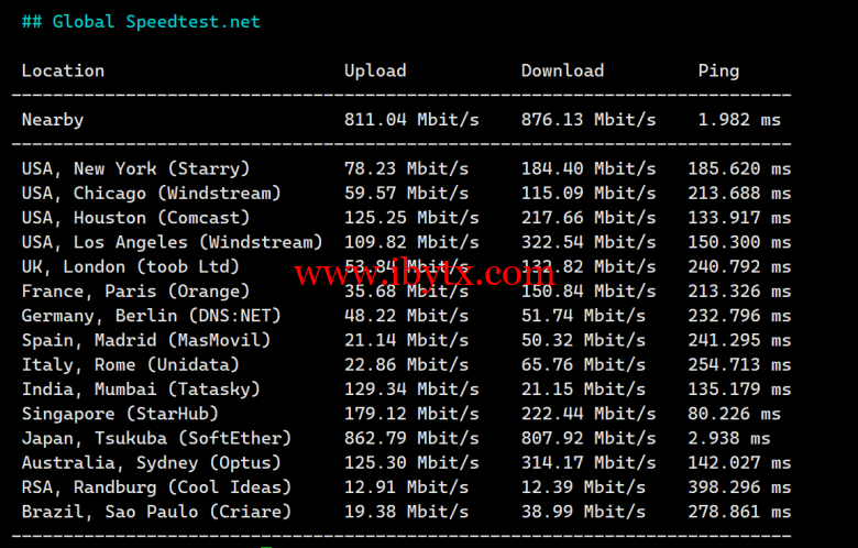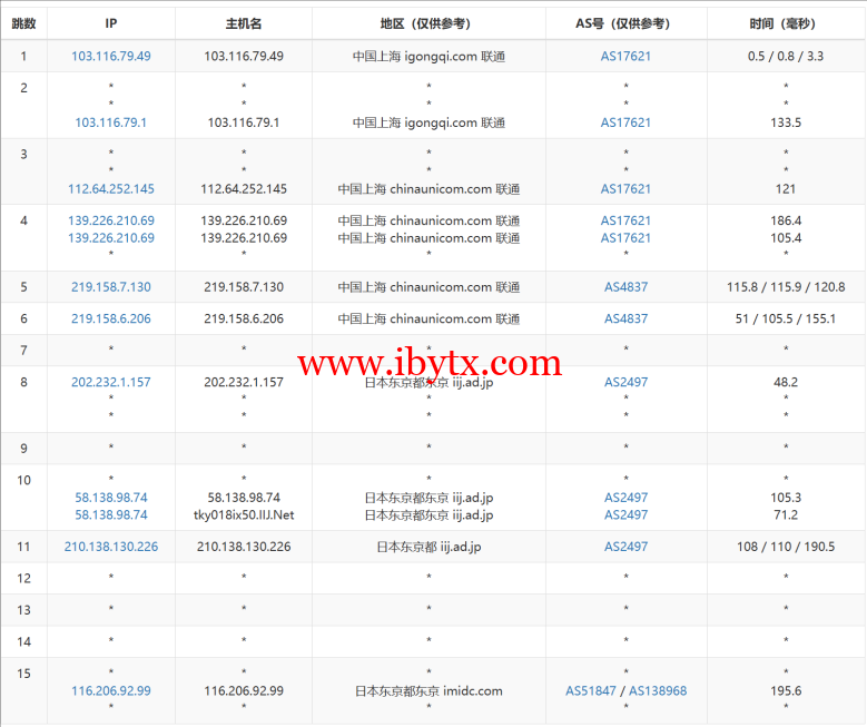 北京联通 traceroute to 202.106.50.1 (202.106.50.1), 30 hops max, 32 byte packets 1 116.206.92.1 8.46 ms AS51847 Japan, Tokyo, hisidc.com 2 10.50.1.1 1.67 ms * LAN Address 3 * 4 * 5 * 6 * 7 * 8 * 9 softbank221111202070.bbtec.net (221.111.202.70) 51.18 ms AS17676 China, Beijing, bbtec.net 10 219.158.3.49 47.31 ms AS4837 China, Beijing, ChinaUnicom 11 * 12 124.65.194.86 50.81 ms AS4808 China, Beijing, ChinaUnicom 13 202.106.50.1 54.72 ms AS4808 China, Beijing, ChinaUnicom ---------------------------------------------------------------------- 上海联通 traceroute to 210.22.97.1 (210.22.97.1), 30 hops max, 32 byte packets 1 116.206.92.1 1.42 ms AS51847 Japan, Tokyo, hisidc.com 2 10.50.1.1 0.42 ms * LAN Address 3 * 4 * 5 * 6 * 7 * 8 * 9 softbank221111202070.bbtec.net (221.111.202.70) 51.80 ms AS17676 China, Beijing, bbtec.net 10 219.158.9.113 58.70 ms AS4837 China, Beijing, ChinaUnicom 11 * 12 * 13 * 14 112.64.250.202 67.46 ms AS17621 China, Shanghai, ChinaUnicom 15 210.22.97.1 54.92 ms AS17621 China, Shanghai, ChinaUnicom ---------------------------------------------------------------------- 深圳联通 traceroute to 210.21.196.6 (210.21.196.6), 30 hops max, 32 byte packets 1 116.206.92.1 5.15 ms AS51847 Japan, Tokyo, hisidc.com 2 10.50.1.1 0.72 ms * LAN Address 3 * 4 * 5 * 6 * 7 * 8 * 9 softbank221111202070.bbtec.net (221.111.202.70) 52.89 ms AS17676 China, Beijing, bbtec.net 10 219.158.9.113 58.55 ms AS4837 China, Beijing, ChinaUnicom 11 * 12 219.158.19.226 70.38 ms AS4837 China, Guangdong, Guangzhou, ChinaUnicom 13 157.18.0.238 73.73 ms AS17816 China, Guangdong, Guangzhou, ChinaUnicom 14 120.80.144.34 72.99 ms AS17623 China, Guangdong, Shenzhen, ChinaUnicom 15 dns2-ftcg.gdsz.cncnet.net (210.21.196.6) 67.86 ms AS17623 China, Guangdong, Shenzhen, ChinaUnicom