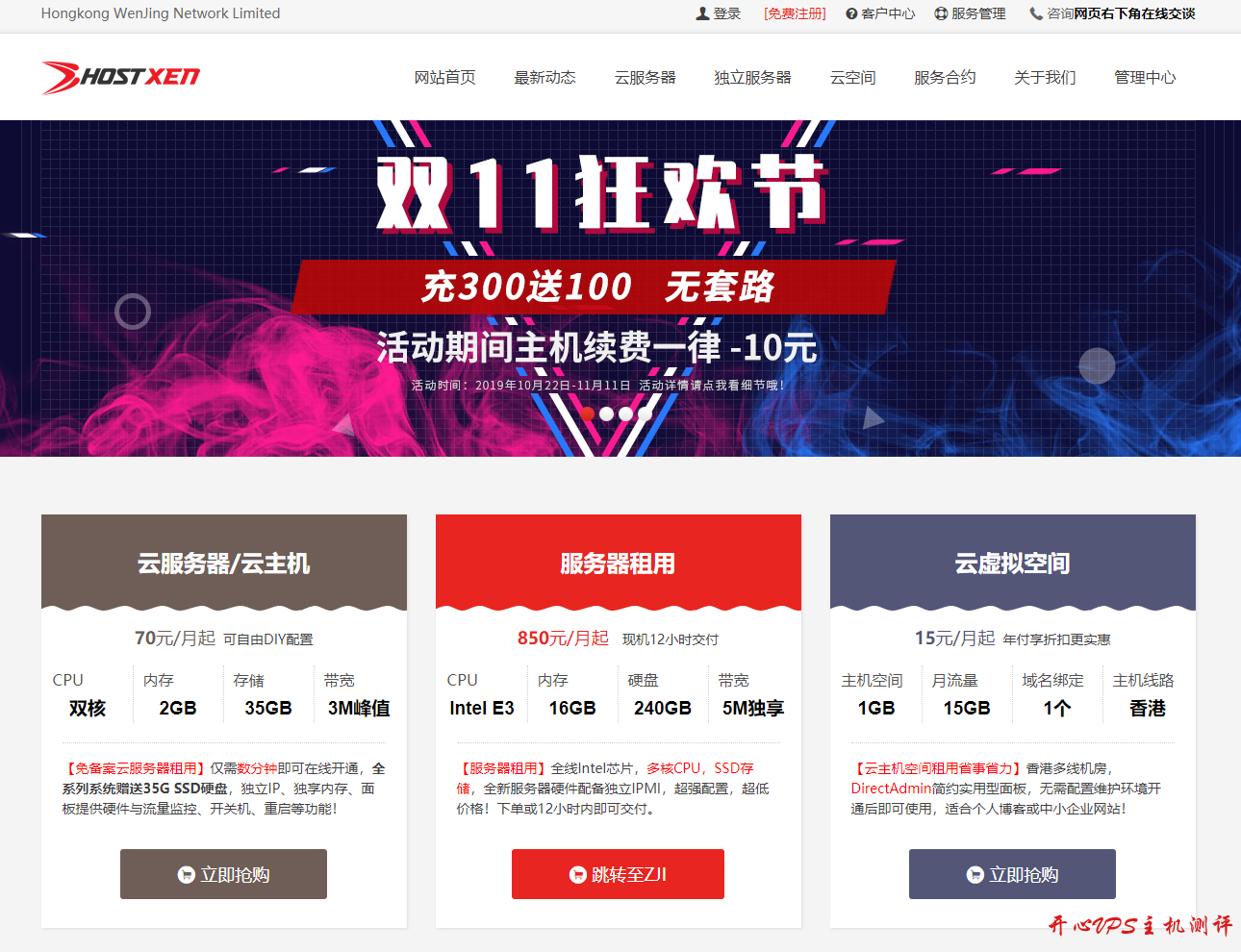 文章名称:《XEN容易超售-HostXen预热双十一:充300送100/续费减10元/新客户送20元/2G云服务器60元起》