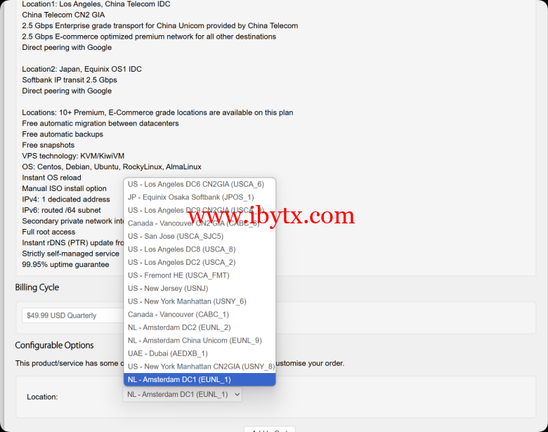 搬瓦工荷兰 EUNL_1 机房可以在如下 CN2 GIA-E 套餐购买时选择。