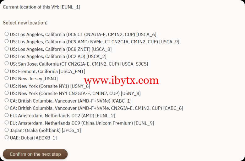 下面就是刚刚购买的 CN2 GIA-E 套餐后台的机房切换页面,购买的时候选择了 EUNL_1,但是会发现可选机房列表里面并没有这个 EUNL_1,只有其他两个 EUNL_2 和 EUNL_9,所以其实就意味着迁出之后就无法再迁入 EUNL_1。